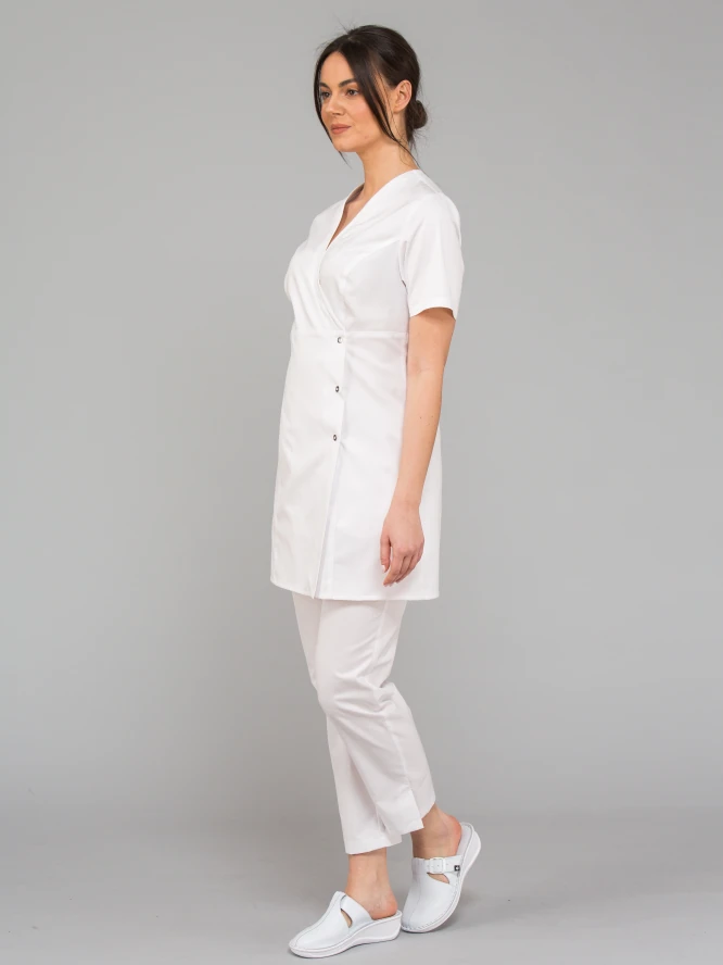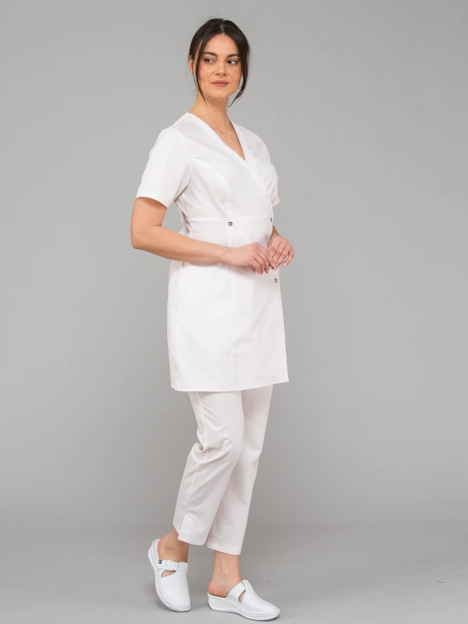 Novo u ELITE kolekciji! Medicinska tunika s visokim strukom BRIGITE. Podsjeća na kimono. Oblači se na preklop. Prilagođena figuri s okomitim rezovima. Izrez oko vrata i dva džepa završeni su ukrasnim naborom utisnutim u nabore. Pričvršćuje se drukerima njemačke proizvodnje bez nikla. Izrađena od visokokvalitetnog, ekološkog, izdržljivog i prozračnog materijala.