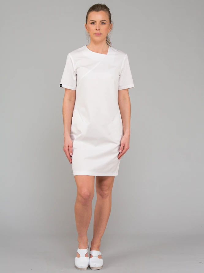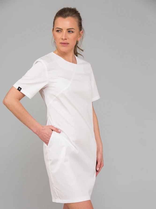 Novo u ELITE kolekciji! Medicinska haljina kratkih rukava ravnog kroja. Ima dva džepa i dijagonalne ukrasne šavove za originalnost. Kopča se straga prekrivenim patentnim zatvaračem. Izrađena od visokokvalitetnog, ekološkog, izdržljivog i prozračnog materijala.